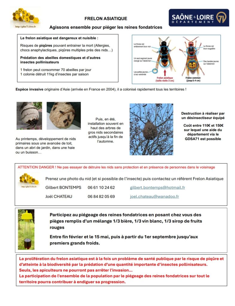 Vous trouverez dans le document ci-joint les éléments qui vous permettront d’organiser le piégeage et aussi des contacts pour signaler les nids ou demander de l’aide.