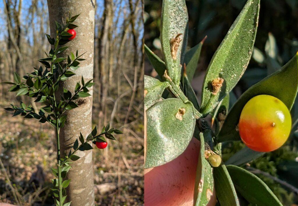Il s’agit de Ruscus aculeatus, le Fragon, Fragon petit-houx ou Fragon faux-houx, sous-arbrisseau sempervirent dioïque, Asparagaceae / Liliaceae.