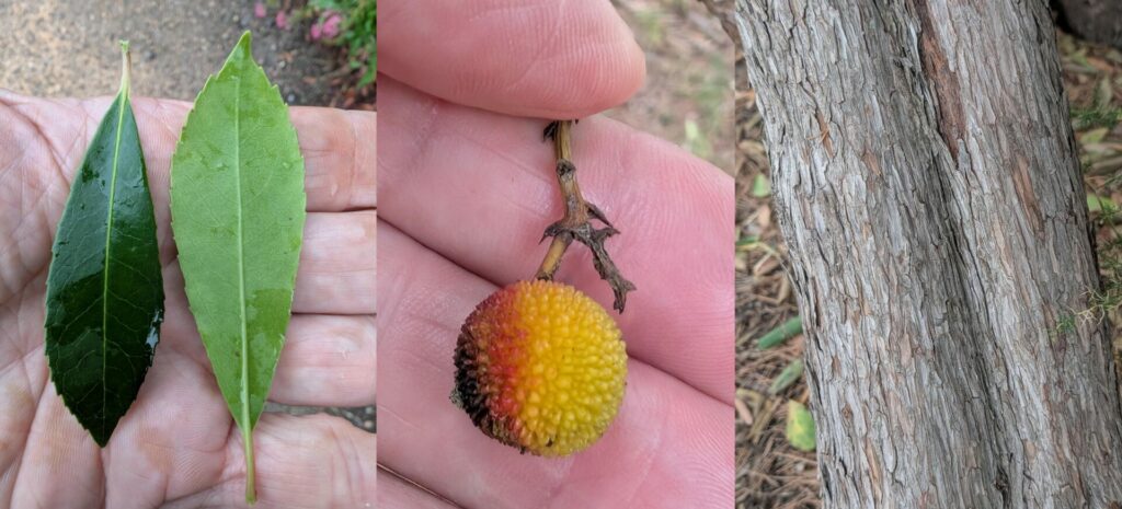 Répartition géographique + arbuste en fruits + arbre + fleur + fruit mûr (arbouse).