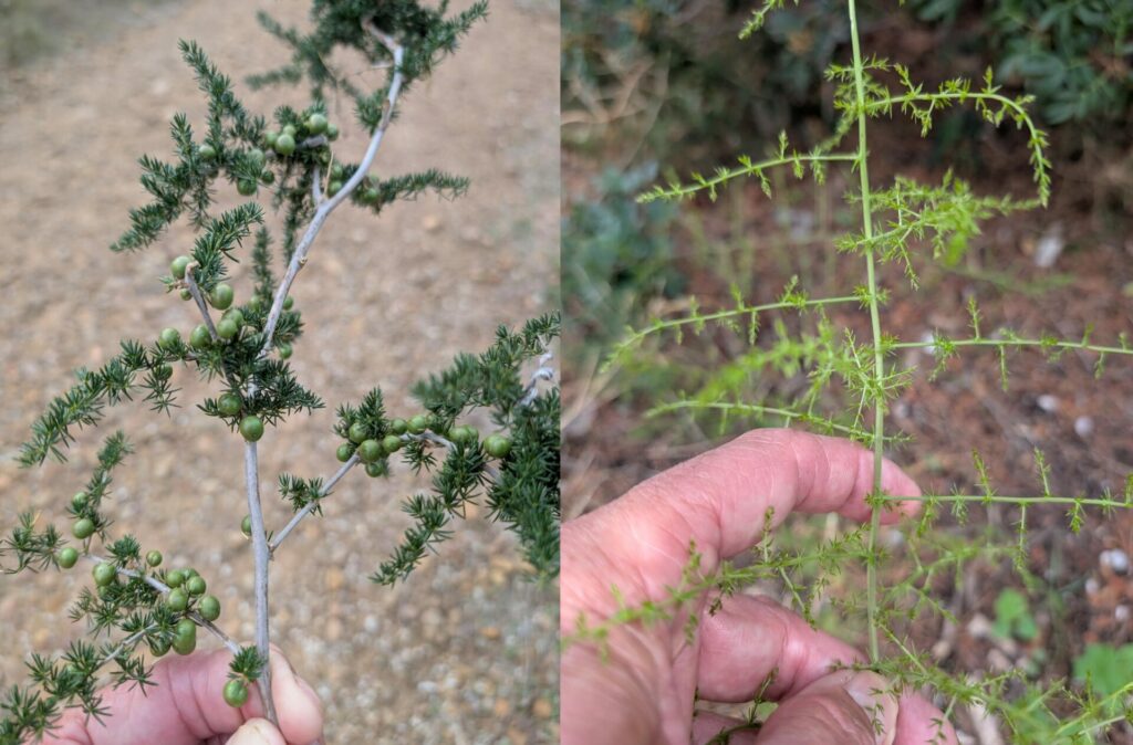 Comme nous allons le voir, cette Asperge sauvage côtoie la salsepareille (dont on déguste également les jeunes pousses), les lentisques, les cistes cotonneux, les lauriers-tin, les arbousiers, les myrtes, les filaires, les bruyères arborescentes, le pin d’Alep…