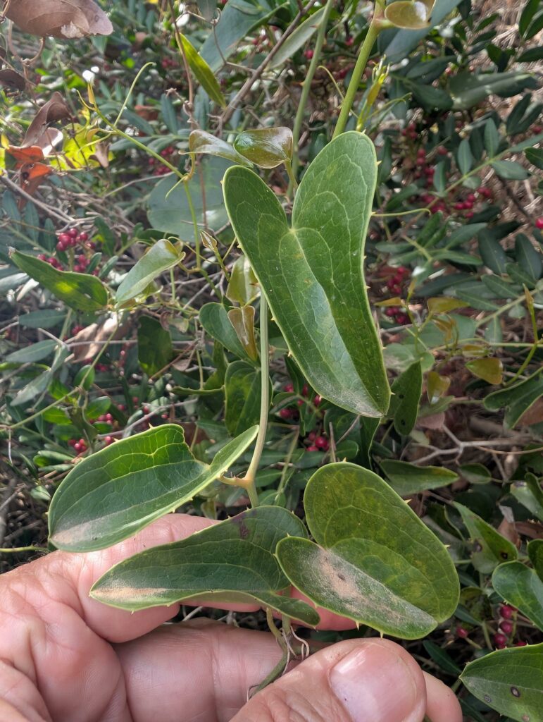 On peut confondre cette plante avec le Tamier commun (Dioscorea communis), mais ce dernier a une tige sans épine. Tige volubile, ligneuse et épineuse. Feuilles alternes, persistantes, luisantes, en forme de cœur pointu. Le limbe coriace est parcouru de 5 à 7 nervures à tracé pseudo-parallèle se rejoignant au sommet, mais, fait exceptionnel pour une monocotylédone, réunies par un réseau de nervures secondaires. Le bord du limbe est épineux (photo). Caractéristique des terres sèches du pourtour méditerranéen.
