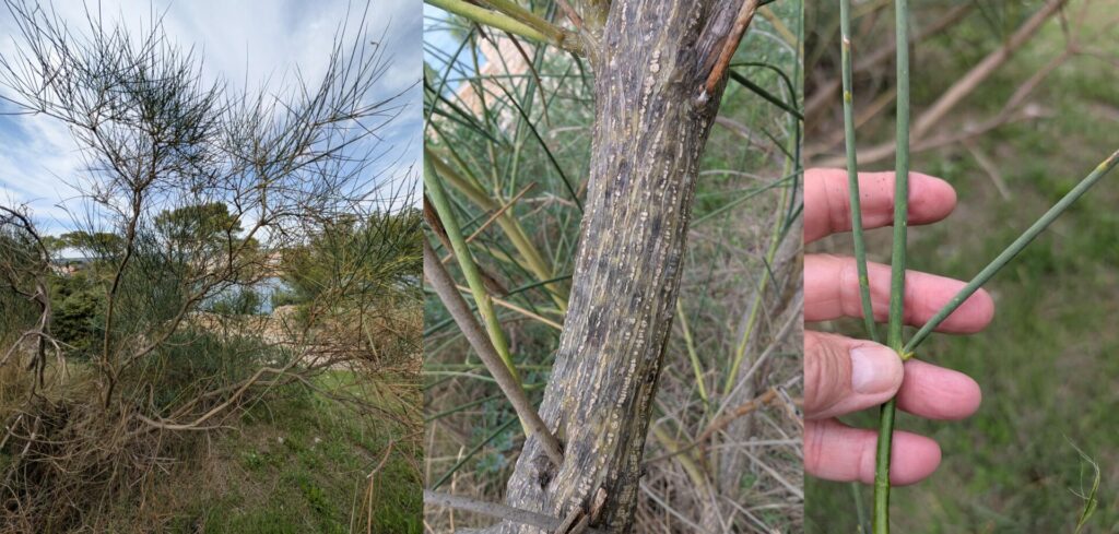 Arbuste dépassant 2 m. Les grandes (22-25 mm) fleurs jaune vif, odorantes, ont laissé place à des gousses noires. Leur dessiccation provoque une torsion de la gousse qui s’ouvre en projetant les graines jusqu’à plusieurs mètres de distance. Adaptation au climat sec, la photosynthèse est réalisée par les rameaux junciformes, compressibles, finement striés, très glabres, d’un vert glauque, portant de toutes petites feuilles étroites, éparses.