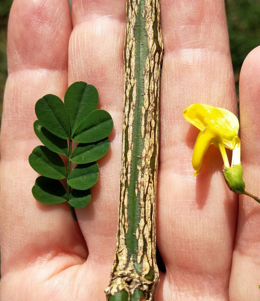 Ses feuilles ont deux à quatre paires de folioles ovales, la foliole terminale étant pus grande que les autres. En vieillissant, l’écorce verte se pare de croûtes beiges longitudinales bordées d’un liseret marron.