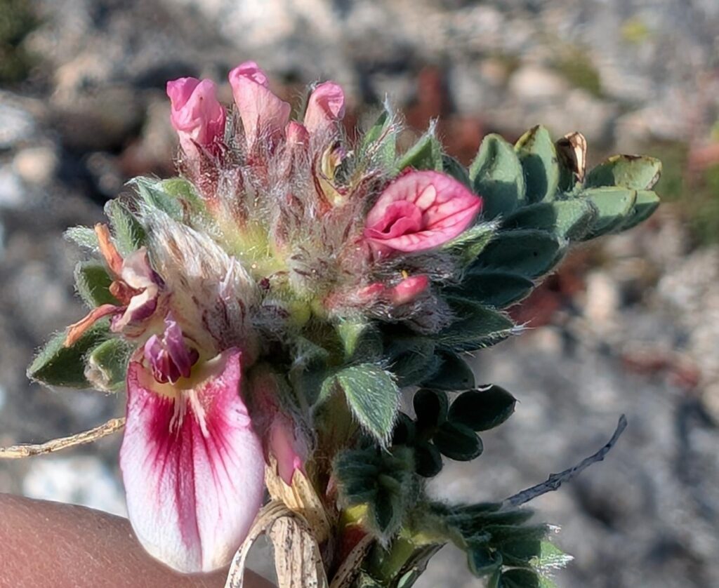 Plante de 10-30 cm, vue vers le sommet de Vergisson où elle colonise les rocailles calcaire sèches et chaudes. Elle forme de petits tapis aux tiges dressées, hérissées de poils, elle est ligneuses à la base.