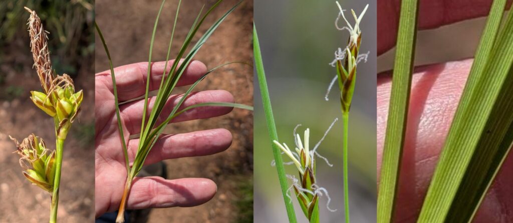 Forme une souche gazonnante dense. Feuilles étroites (2-3 mm), striées, rudes, épi mâle terminal solitaire, roux et blanc, épis femelles à utricules globuleux, pauciflores, collés à l’épi mâle et subsessiles. Orchid-nord. Bractées engainantes, à pointe herbacée. Observez l’écaille brune associée à chaque utricule vert (photos 1 et 3).
