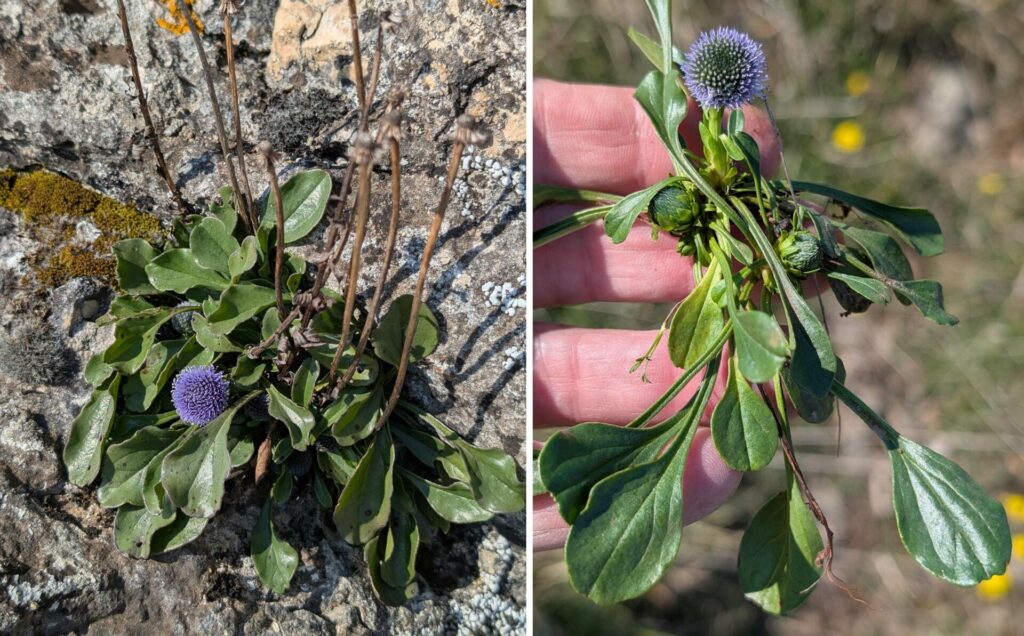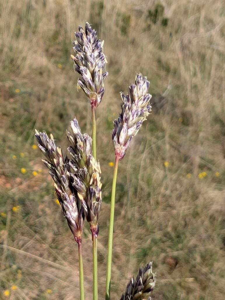 Inflorescence de Sesleria caerulea, la Seslerie bleue, Poacée poussant en touffes parfois épaisses, cette Poacée stabilise les pentes des sols secs, rocailleux et les pelouses sèches sur sols calcaires des 2 roches de Solutré et Vergisson. Cette graminée y est très courante, elle est facilement reconnaissable à son épi floral assez court lavé de bleu foncé, aux reflets métalliques vers le sud (réaction contre les U.V.) et vert de l’autre.