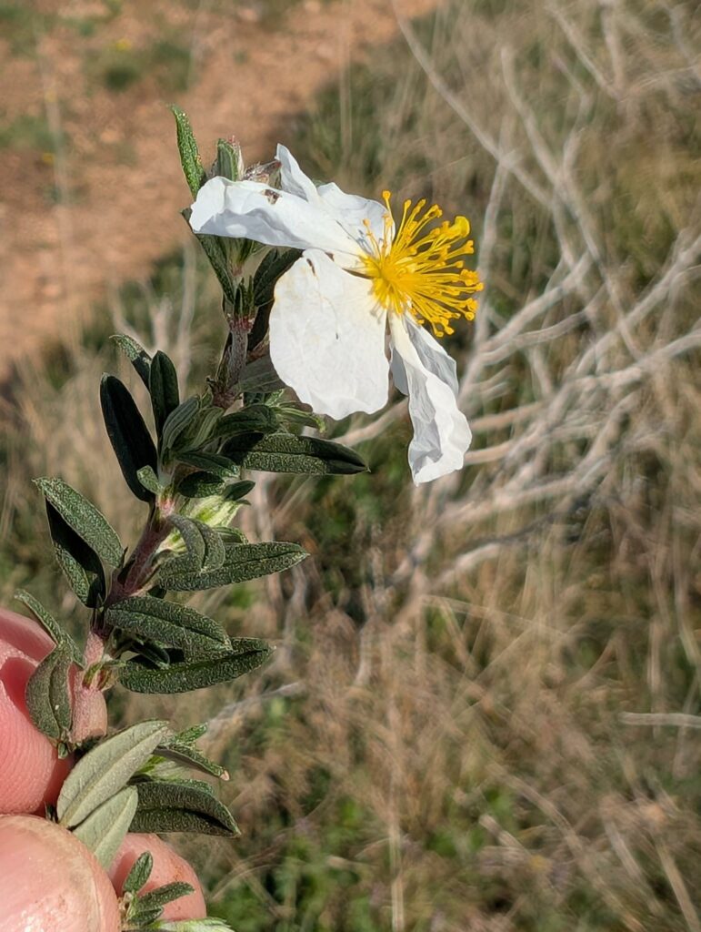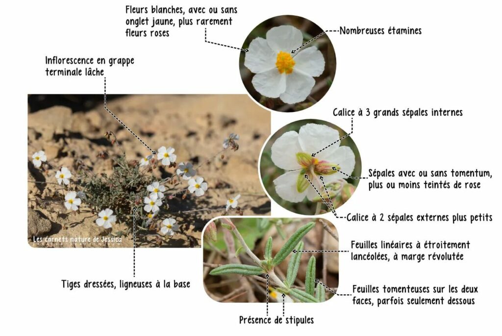 L’Hélianthème des Apennins est un sous-arbrisseau vivace ramifié à la base, d’une hauteur de 15 à 50 cm. Tige étroite et velue, ligneuse à la base. Se rencontre dans les lieux rocheux ou herbeux sur sols calcaires. Abondant sur les pentes des roches de Vergisson et de Solutré. Feuilles à très court pétiole, opposées, entières, très étroites (elliptiques à linéaires), plus ou moins enroulées sur les bords, de couleur vert grisâtre en raison de leur importante pilosité :
