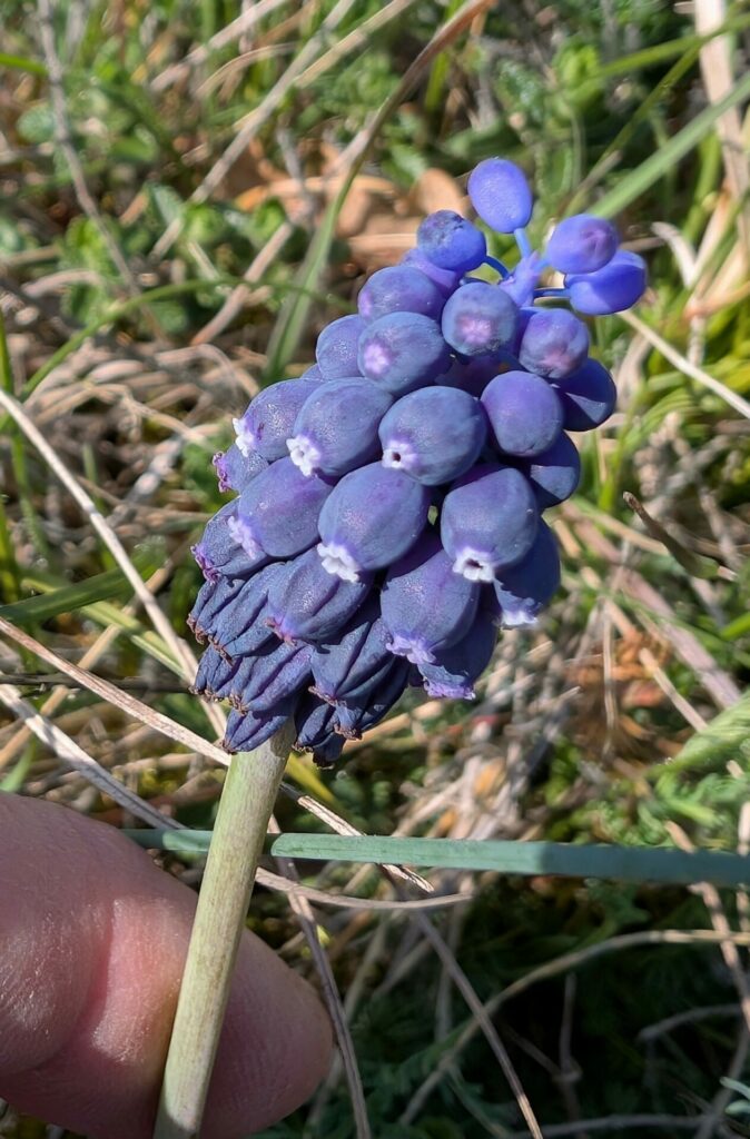 FloreAlpes : Ce muscari est plus petit que le muscari à toupet mais se rencontre beaucoup plus souvent, et fleuri plust tôt en saison. Ses fleurs sont en grappe terminale, composée pour la majorité de fleurs stériles. Les feuilles sont très étroites, semi-cylindriques marquées d’un sillon central. Bulbe* principal assez gros et entouré de nombreux petit caïeux. A ne pas confondre avec le muscari botryoide, aux feuilles larges et plus courtes que la tige, et aux fleurs plus rondes, sensiblement aussi larges que longues.
