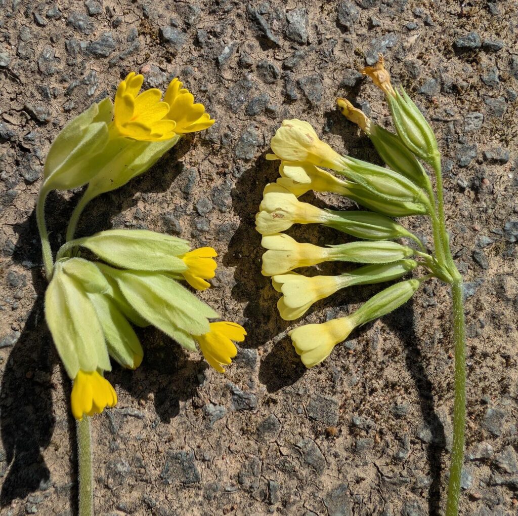 Primula elatior, Primevère élevée, ou Primevère des bois, et Primula veris, Primevère officinale, Primulacées. P. elatior : fleurs jaune soufre, P. veris jaune doré et pétales peu échancrés. Elles sont portées par un pédoncule long et tomenteux. Comparaison des 2 espèces par Pierre Goujon.