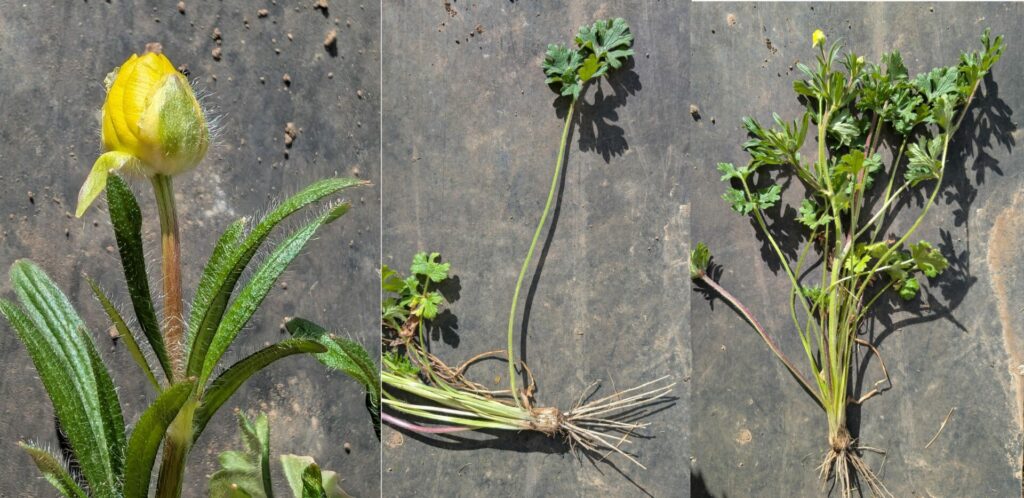 La renoncule bulbeuse tire son nom de son caractère distinctif : une tige souterraine (ou rhizome) gonflée comme un bulbe et située juste en dessous de la surface du sol (Photos 2 et 3).