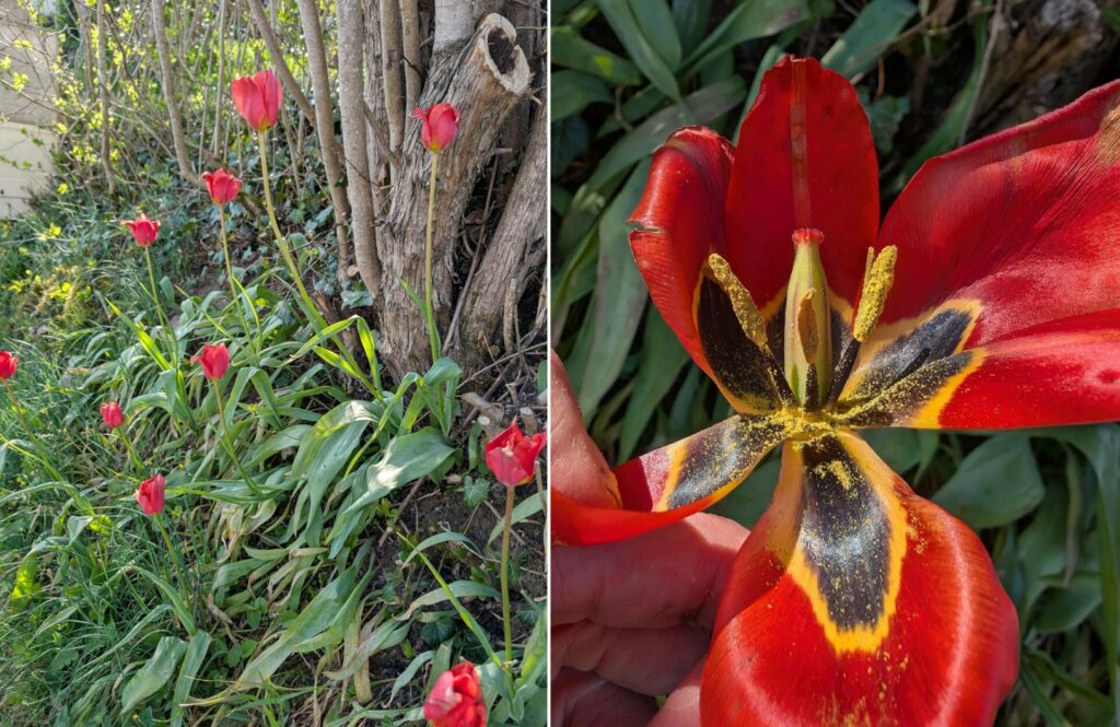 FloreAlpes : Magnifique tulipe originaire d’Asie introduite vers le XVIIIème siècle et depuis naturalisée dans le sud de la France. Elle se reconnait à sa couleur rouge et à ses tépales acuminés (terminés en pointe), les extérieurs plus longs que les intérieurs. L’intérieur de la fleur est maculé de noir bordé de jaune. Les macules sont allongées, surtout les externes, à la différence de celles de T. raddii dont les macules sont courtes, arrondies et toutes de même taille.