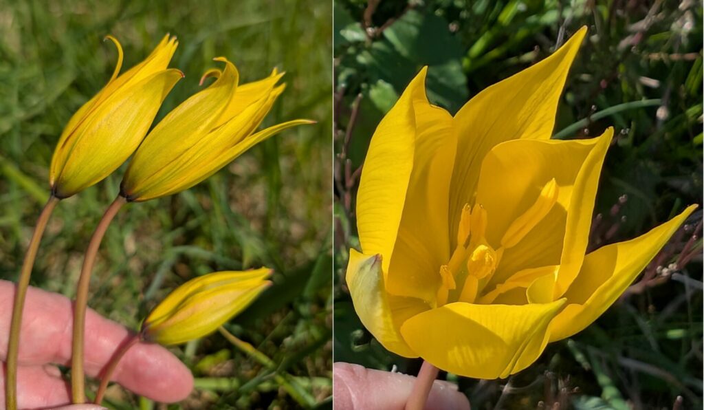 Tulipa sylvestris subsp. sylvestris, Tulipe des bois, Liliacée. A ne pas confondre avec la tulipe australe Tulipa sylvestris subsp. australis dont le dos des tépales sont rougeâtres et non verdâtres (photo1).