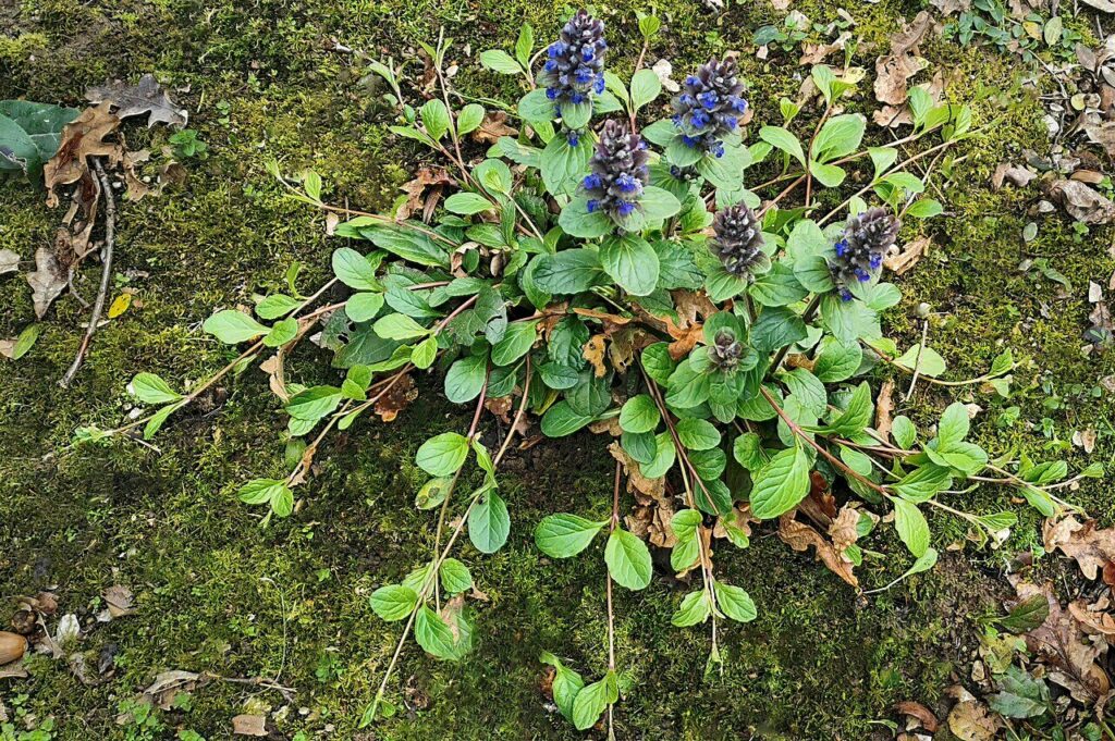 La bugle pyramidale a un port pyramidal comme un sapin, (il est espacé chez la bugle de Genève) et ses feuilles sont souvent teintées de rouge (anthocyanes protecteurs) lorsqu’elles sont jeunes (partie supérieure).
