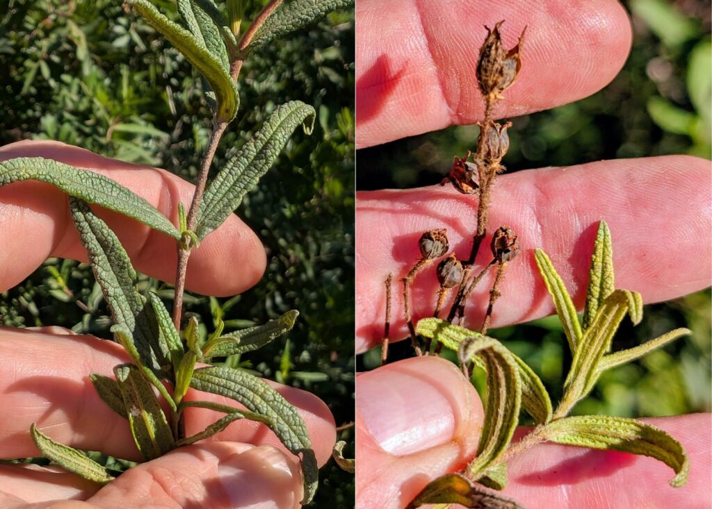 Photo 2 : Son feuillage persistant gris clair est composé de feuilles simples, sessiles, opposées, oblongues-elliptiques et couvertes de poils étoilés.