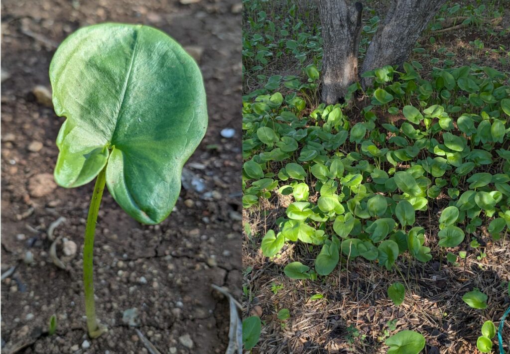 7: Ses feuilles, ovales, en forme de cœur, et portées par de longs pétioles, sont hautes de 10 à 16 cm et larges de 7 à 10 cm. Elles sont d’une couleur vert vif et parfois maculées de taches plus claires.