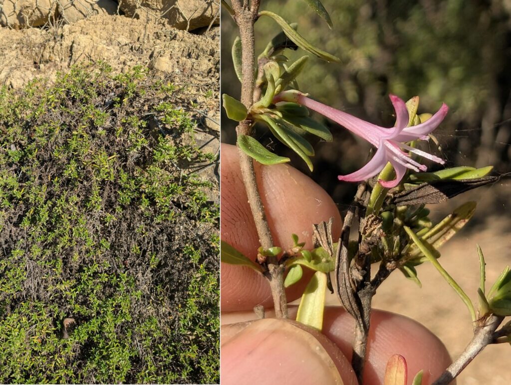 Fleurs roses, composées d’un tube fin de 1 à 1,5 cm de long et de quatre lobes lancéolés, étalés et recourbés, atteignant 4 mm de long, elles sont regroupées en denses inflorescences terminales.