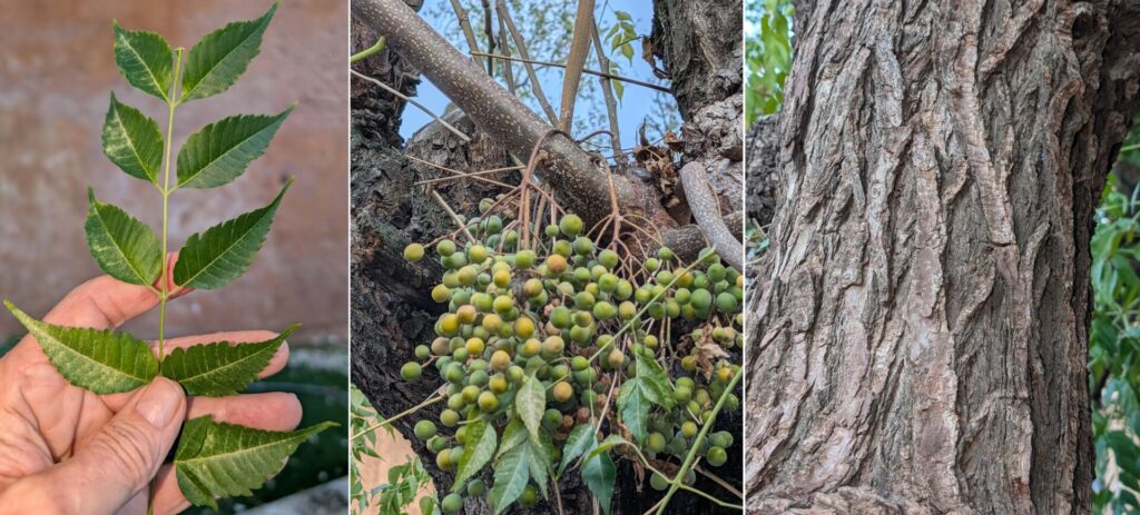 Fleurs, Fleurs et feuilles, le noyau du fruit du margousier est percé avec, autour du trou, 6 locules contenant chacune une graine. Les feuilles de l’arbre virent au doré en hiver.