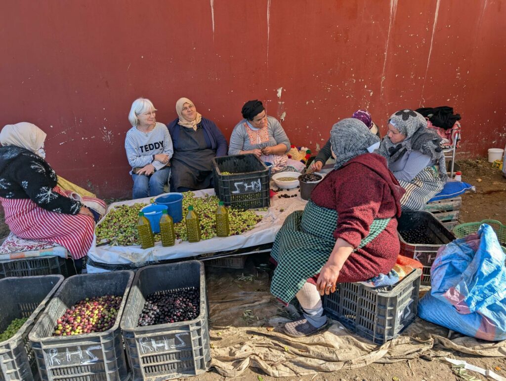 Ci-dessous, les femmes écrasent les olives, cela permet d’accélérer la désamérisation puis elles seront mises en saumure. Observez photo ci-dessus les seaux de sel provenant de mines à ciel ouvert.