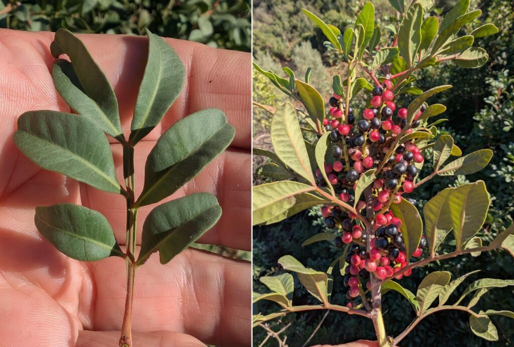 Ses feuilles sont paripennées* (elles se terminent par une paire de folioles, tandis que celles des autres pistachiers se terminent par une foliole terminale) (Photo 1), ses fruits, d’abord rouges, puis noirs, ne mûrissent pas tous en même temps (Photo 2).