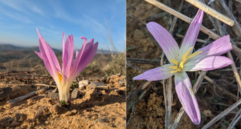 1 : En sortant du gîte, en descendant vers le lac en bord de route : Colchicum fllifolium, Colchique à feuilles filiformes, Mérendère à feuilles filiformes = Merendera filifolia, Colchicacée (†Liliaceae).