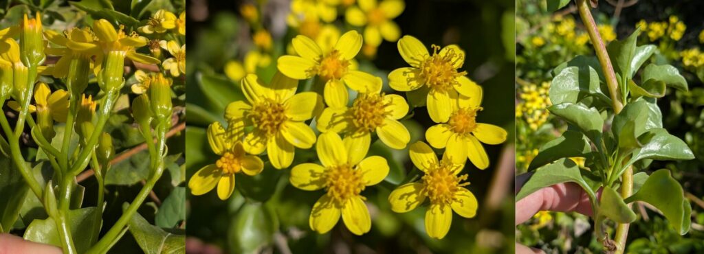 N.B. : ressemble beaucoup à Delairea odorata, le Séneçon grimpant ou Lierre d’Allemagne.