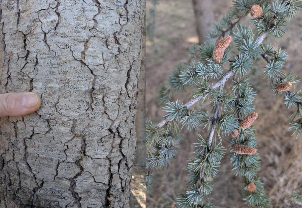 Le cèdre est une espèce monoïque, certaines branches portant des cônes (chatons) mâles, d’autres des cônes femelles. (Photo 2 : branche à cônes mâles)