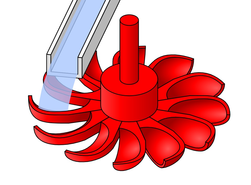 L’eau arrive sur une roue à aube à pales de bois qui, mises en rotation par la force du courant, vont transformer le mouvement linéaire de l’eau en un mouvement rotatif de l’axe qui fera tourner la pierre abrasive située au dessus dans le moulin.