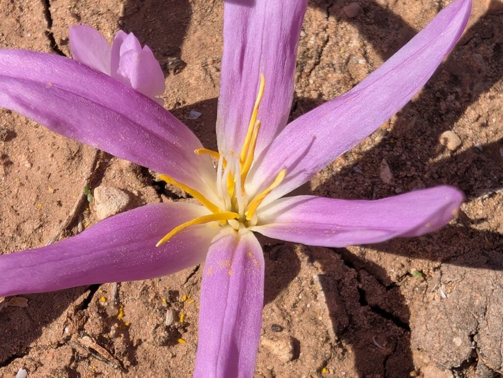 Colchicum fillifolium (déjà vue) et Chamaerops humilis, un palmier (Arecacées), dans sa taille habituelle, il est tout à fait indigène au Maghreb. (Peu après Aït Ou Ba Allal)
