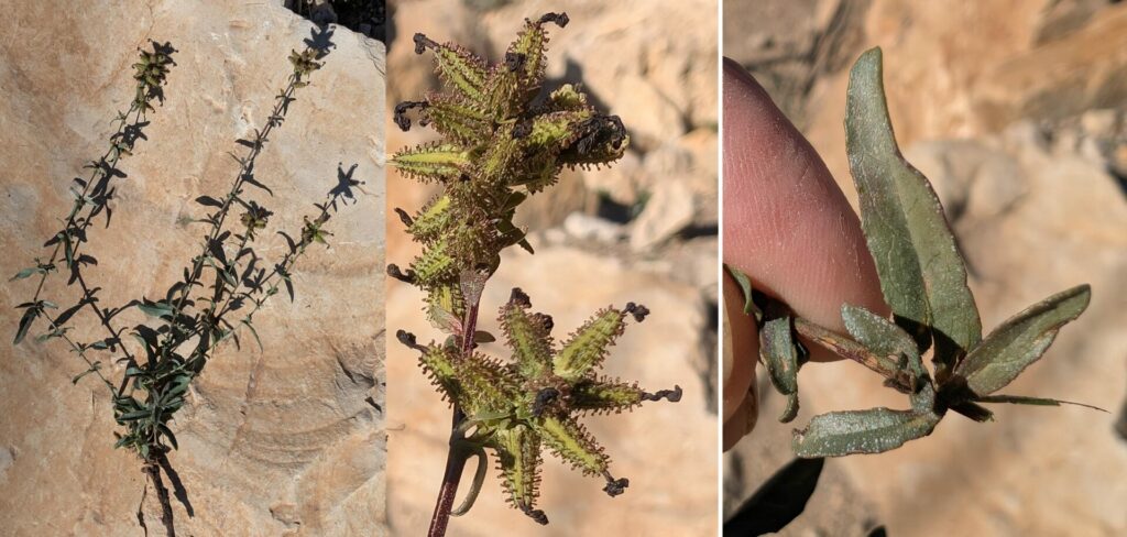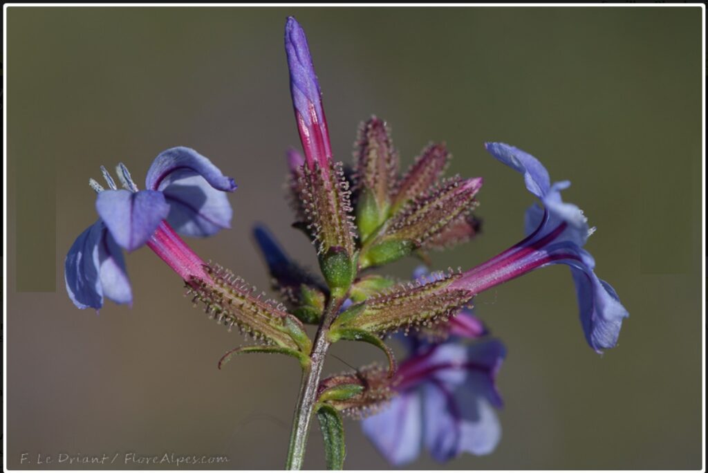 FloreAlpes : Plante ligneuse très ramifiée à fleurs bleutées assez proches de celles des limoniums, mais de plus grande taille et à calice original pourvu de nombreuses glandes pédonculées (photo ci-dessous).